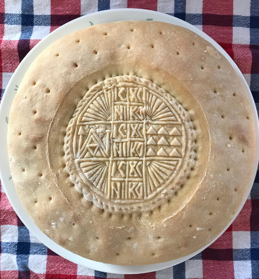 The Prosphoro (Offering Bread) is a very simple recipe. Flour, Salt, Yeast and Water. You will find different combinations of these ingredient quantities posted in various cookbooks and on-line. All will make a fine Offering Bread – but, the trick is making a really good seal on the bread! One that doesn’t disappear in the leavening and baking process. The seal I use to make the impression on the bread is a plastic one that I bought many many years ago.